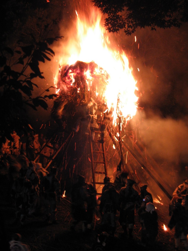 1200年前から行われていると伝えられる天下の奇祭です。愛知県幡豆町の神明社で行われ、柱を燃やしてその中の木を福地乾地の二組で取り合うというもの。同じ愛知県でありながら私も殆ど知らなかったお祭ですが、今回怪作戦の三人で足を運ぶこととなりました。そんな火祭りレポート。 午後2時半頃、鳥羽の神明社に男たちが集まり、集会所で晒一枚の褌姿になって禊ぎの準備をする。既にテレビ局のカメラが何台か集まっていた。男たちは奉祀者と呼ばれ、主に年男と、有志の男性によって構成される。まだ2月の寒空の中、さぞかし寒いであろう奉祀者たちは集会所の中で酒を飲みながら輪になって「ワッショイワッショイ」と掛け声をあげる。そうでもしていなければ寒くて凍えてしまうのだろう。 3時になり、奉祀者は集会所から出て、神社から海まで練り歩く。 道路を一時通行止めにして、奉祀者と役員たちが歩いていく。この役員の衣装は、見事な刺し子の法被であり、流石伝統的な祭だと思わせる。先頭には提灯、幣を取り付けた棒を持った神男(しんおとこ・)2名が立つ。道々には見物客が立ち並び、さながら駅伝のようだった。この間も「ワッショイ」の掛け声は止むことがない。 浜辺に着くのが3時20分頃、浜での大祓の後、男たちが「ワッショイ」の掛け声と共に海に入っていく。 殆どは足が浸かるばかりだったが、若者は腰まで浸かり、更に神男たちは胸辺りまで浸かる沖まで出る。意外と遠浅の海だった。 浜辺では役員が枯れ草に火を付けていた。殆ど見物人の目の前で燃やしている。海から出てきた男たちが火に当たる為だろう。男たちの掛け声に冷たい風、目の前で枯れ草のパチパチ燃える音やその熱気が渾然一体となって、得も言われぬ空間を作り出している。奉祀者たちは海から上がって暫くすると駆け足で神社へ戻っていった。 夕方からは人が増えてきて、特に沢山のカメラマンが柱の真ん前に陣取っていた。境内の坂の上には柱が立っている。これは中心に神木(しんぎ)と呼ばれる二本の柱を立て、その回りに竹や藁を葺いたもので「スズミ」と呼ばれる。これは16尺(6メートル)で地上に出ている分が12尺、これは一年の月の数を表しているんだとか。 「どんな野生動物だ!」 奉祀者はこの時「ネコ」と呼ばれる。火を除ける衣装をつけた姿が猫に似ている為だ。 拍子木を打ち、「ゆすり棒」という棒を揺らしながら奉祀者たちがスズミの方に進んでくる。先頭には矢張り提灯が掲げられている。この「ゆすり棒」は松でできており、スズミに火を付けたりその後スズミを揺することに由来しているそうだ。神男たちの後を箒のような木を持った奉祀者たちがあり、これは「はらい棒」といい落ちてきた火を払う為のものだという。 いよいよ火を付ける段であるが、火は火打ち伝承者と呼ばれる家が代々行っているという。未だに火打ち石でその火をつけるのだ。まず火打ち伝承者が石を打って「ゆすり棒」に火を付ける。カチカチと良い音が響く。そして火のついた「ゆすり棒」から、スズミの上部にある藁に点火するのだ。 空気も乾燥しており、火は瞬く間に拡がった。このとき8時。 上の写真のスズミに、梯子が付いていることが確認頂けるだろうか。 ネコたちは、この梯子に登り、燃えさかる炎が上から落ちてくる中、このスズミを手掴みで揺らすのだ。 その姿はまさに勇壮、見物人からも、歓声や拍手が湧き起こる。 他の奉祀者は「はらい棒」で落ちてきた火を一カ所に集め、下から燃えるのを防いでいる。 それにしてもネコたちは代わる代わる、上から落ちてくる火をものともせずにスズミを揺らしにかかっている。この時、青竹が良く鳴るとこの一年は雷が多い、良く炎が上がると天気が良いと云われている。 これのユスリは先程の「ゆすり棒」と同時に揺すられ、三回に分けて行われる(一の棒、二の棒、三の棒と呼ばれる)。 さて、この祭の本分は、福地と乾地という二つの組のどちらが先にスズミの中の神木を取り出せるかを競い合う神事であり、福地が先に取ればその年は豊作、乾地が先に取り出すとその年は不作という占いの意味も含んでいた。そんなの福地が勝つに決まっているとお思いになるかも知れないが、ここ数年は乾地の勝ちが続いていたそうだ。 ネコたちは力一杯引っ張っていたが、今年先に取り出したのは福地の方であった。 この神木を拝殿に奉納し、その後地中に埋もれている十二縄を取り出す。そして縄の奉納が終わると、火祭りは終了する。 竹の燃え残りを持ち帰って箸にすると、一年間歯の病に罹らないそうだ。 こういった福地、乾地(つまり作物が良く実る土地と不毛な土地)に分かれて神事を行うのは、豊橋の鬼祭にも見られることで、正月の際においては良くこういった競い合いをして占う神事が行われるようだ。興味深いことに、三重県の鳥羽にも、似たような火祭りが行われているという。 妖怪は関係ですが、面白い祭でした。まだまだ