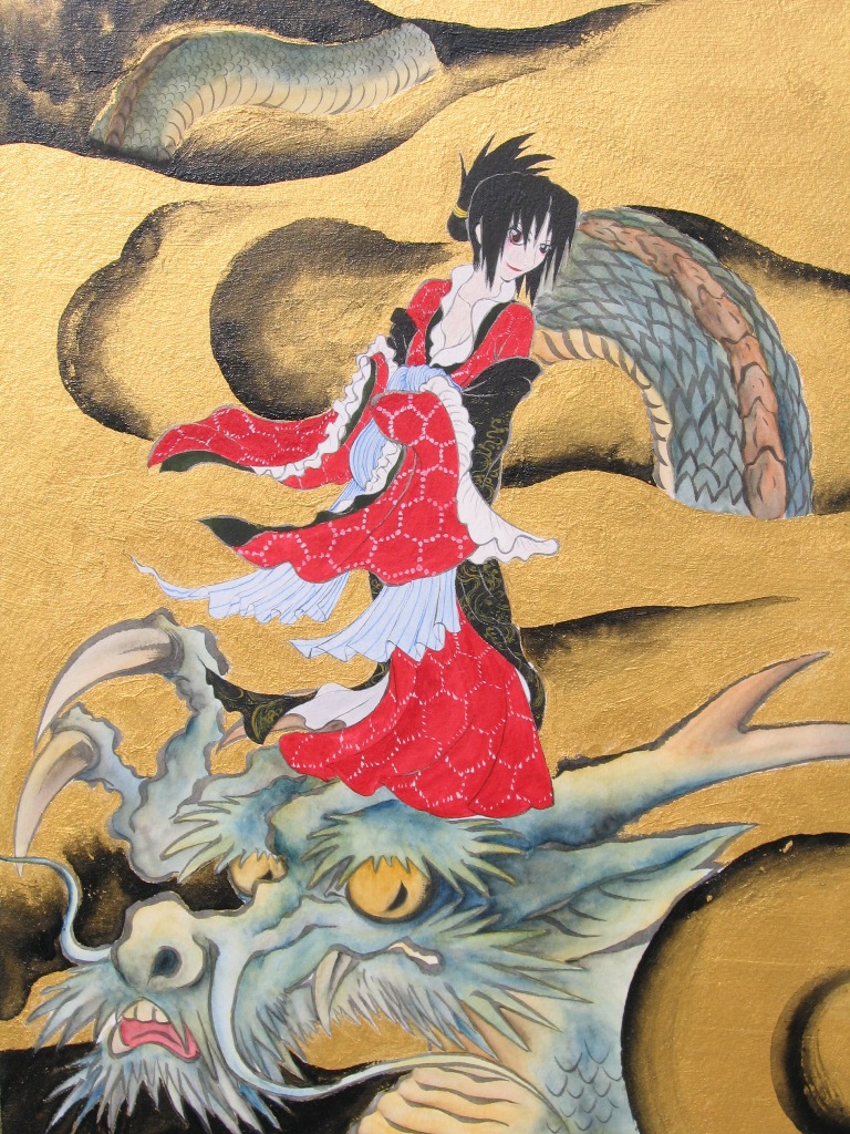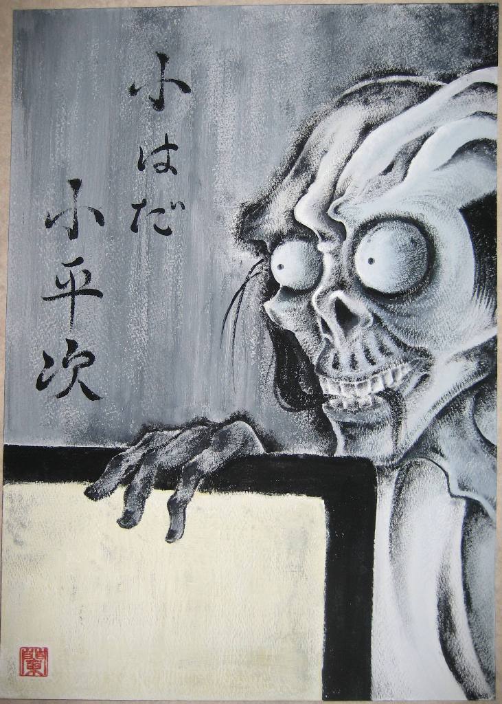 …なかなか説明するとややこしいのですが、 http://twitter.com/dokurojo 中畝酒店さん(酒と魚のうお京さん)とコラボして、 http://store.shopping.yahoo.co.jp/uokyo/index.html 髑髏食品社:髑髏ノ酒と銘打って、各種髑髏、妖怪日本酒を販売されています。 その中で「ダルマ正宗」という古酒にクロップドヘッズをラベルにデザインした 「髑髏古酒」ってえのがありまして。 じゃあアレンジして髑髏ダルマ正宗を描いてみよう!という事で冒頭の色紙と扇子にようやく繋がります。 2009.06.19 Fri 01:30:48 カラーイラストのこと2009.05.07 Thu 02:16:56 節句のこと |
