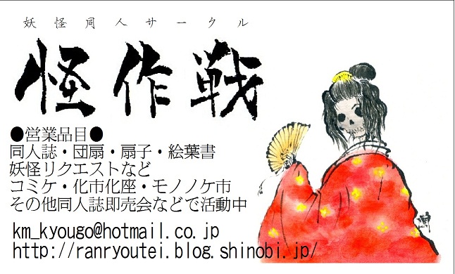 2011.01.26 Wed 02:27:55 御骨神社大祭に参加しました!2011.01.25 Tue 20:54:08 今冬扇子作品紹介の続き①…えー、またまた結構日が空いてしまいました。テラでございます。 そして、どんどんご紹介していないこの冬の扇子作品が溜まってしまっております…。 色々進めている事、話題などもあるのですが、順次更新させていただきたいと思います。 桂 つかさの作品。 絡新婦。桂君の絡新婦は珍しい。可愛らしい。絡め採られたいですねー。 姑獲鳥。京極先生小説登場妖怪が続きますねー。 鬼女紅葉。戸隠行った事ないんですよねー。今年行けるといいなー。 蘭陵亭の作品。 清姫。比較的珍しい題材ですかね。 酒呑童子。とりあえず、ブログ上は「酒呑」表記で勘弁…。 狐。実に実に根強い人気。もう、これまで何枚描いたんでしょう…。 狂骨。これまでに描いた狂骨とまたタッチが違います。 陰摩羅鬼。「鶴っぽくなってしまった」とは本人の弁。 …とりあえず本日はここまで! 実はまだ、結構ご紹介していない作品一杯だったりいたします…。 更新はサボり気味ですが、作品は頑張って描いてます! 桂と蘭が! …更新も頑張ります。 2011.01.09 Sun 22:56:04 御骨神社大祭にちょっとだけ参加!えー、あと何時間後かっていうレベルの超直前告知ですが…。 明日(1/10(月))に開催される「御骨神社大祭」に、私、桂のみちょっとだけ参加させていただきます。 四条堺町通り上ル「錦湯」で 平成二十三年 一月十日十三時より 髑髏城イベント「御骨神社大祭!!」が開催されます。 出展団体 京髑髏 舞骨堂 怪談社 中畝酒店 なみまにさんかく ヲモカゲ堂 他多数 協力 錦湯 楽府 京都銭湯フェス 桃色女剣劇団 御骨神社大祭次第 巫女カフェバー 髑髏神籤 髑髏神輿 紙芝居 物販展示多数 入場無料 銭湯怪談 錦湯実話怪談会 入場2000円 開場18時半 予約075-221-6479 問合せ先 075-221-6479「錦湯」 妖怪リクエスト(お好みの妖怪を扇子にイベント中に描かせていただく)のみでの参加になります。 他の在庫の販売は基本的にはありません。 よろしくお願いいたします。 2011.01.06 Thu 22:41:53 新年のご挨拶と旧年中の作品紹介①