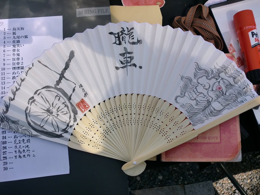 2010.06.29 Tue 21:27:13 今更感に定評のあるモノノケ市レポート②…二月前のイベントを思い出してレポートを書くというのも、なかなかモチベーションを保つのが大変です(苦笑)。しかし、せっかくの蘭陵亭や桂の団扇、扇子のイラストを見ていただけたらと思いますので、なんとか頑張ります!因みに元の文章は個人的に化け大倶楽部の日記に書いたレポートなのですが、加筆修正、増補改訂版としてお届けいたします。 …全然人のいない早朝の大将軍八神社。 社務所の片隅をお借りしていそいそと着物に着替えさせていただく。 …暑い!着物暑いよ!ちょっと前まで寒いくらいだったのに…。 (*五月当時…。) そうこうする内に人も集まり始め、いよいよイベント開始です。 頒布物:同人誌「妖怪画本」第一、二巻「妖怪写真集」 委託の御田鍬;さんの同人誌「妖怪図会 丑三月」 「絵葉書各種」手書き団扇、扇子、A4額入百鬼夜行 毎度御馴染みの「妖怪リクエスト」も実施。 怪作戦のスペースに来ていただいた事のある、 稀有な閲覧者様には説明不要かと思いますが、 怪作戦では、お客様のご希望の妖怪をその場で団扇や扇子描かせていただいて販売する 「妖怪リクエスト」というものをやっております。 以下、とりあえず、今手元にデータのあるモノノケ市一日目の作品紹介。 まずは蘭陵亭の作品から。 ぬらりひょん。 タンコロリン。 釣瓶落とし。 しっぺい太郎。言わないと只の犬だ(笑)。流石に初挑戦。 かぶそ。 おとろし。 朧車。なかなか斬新なレイアウトかと。 旧鼠。たぶん初挑戦。茶色が御洒落。 陰摩羅鬼。 濡女。 烏天狗。 橋姫。 続いて桂つかさの作品。 震々。 毛倡妓。 続いて五徳三姉妹(笑)。 丑時参。 橋姫。蘭陵亭とは大分違います(笑)。 五徳猫。 火車。これも妖怪画本第二巻つながりです。 鉄鼠。 …今、手元にデータがあるのはこれくらいです。他にも色々描いたような…。 で、以前に書きましたように、新聞の取材を受けたりもしたのですが、 テレビのニュースでも、取り上げていただきました。 因みにその時描いていたのが「海座頭」なんですが…。 (写真残ってません…) レポーターさんにどんな妖怪か聞かれましてですね…。 …。 いやいやいや! お姉さん、座頭市って知らないですか? カメラの前で「海に現れる○○○」とか言っちゃっていいの? とか説明に困ったという…。 作品写真を載せていったらかなり長くなってしまいました。 一旦切って③に続けます。 2010.06.25 Fri 00:02:51 今更感に定評のあるモノノケ市レポート①「兵は拙速を聞くも、未だ巧みの久しきを賭ざるなり」と。 スピード第一。次善の策でも速やかに行え。最善の策でも しかし、孔子先生も 「過ちては則ち改めるに憚ること勿れ」 とおっしゃってくださっております! …という訳で、開催から既に一月以上経ってしまっちゃっちゃっておりますが、