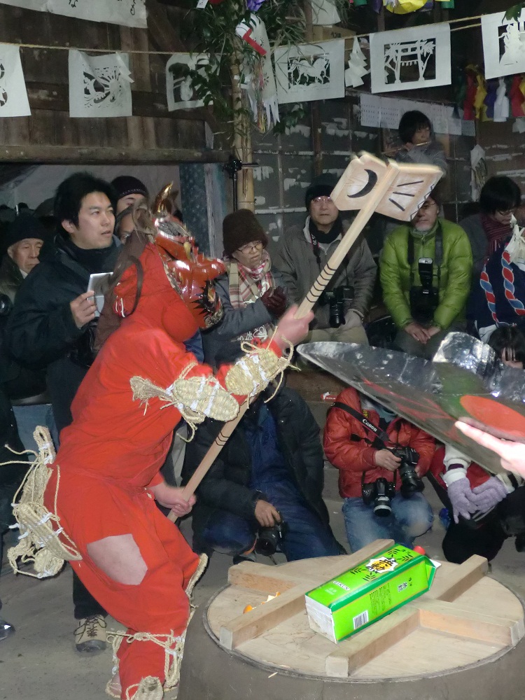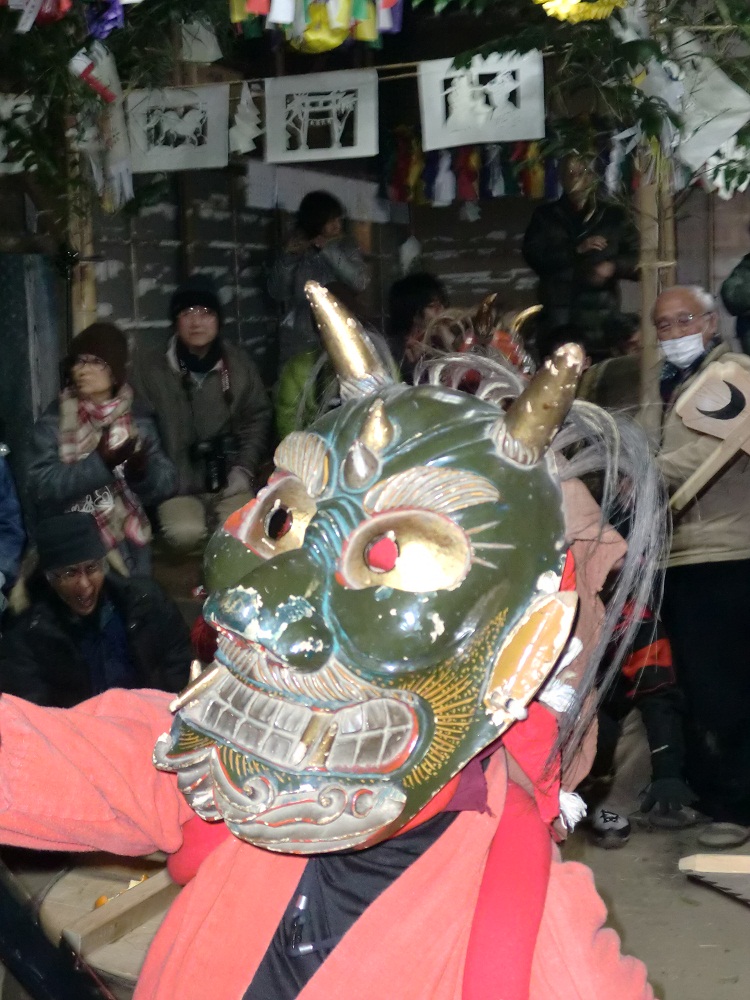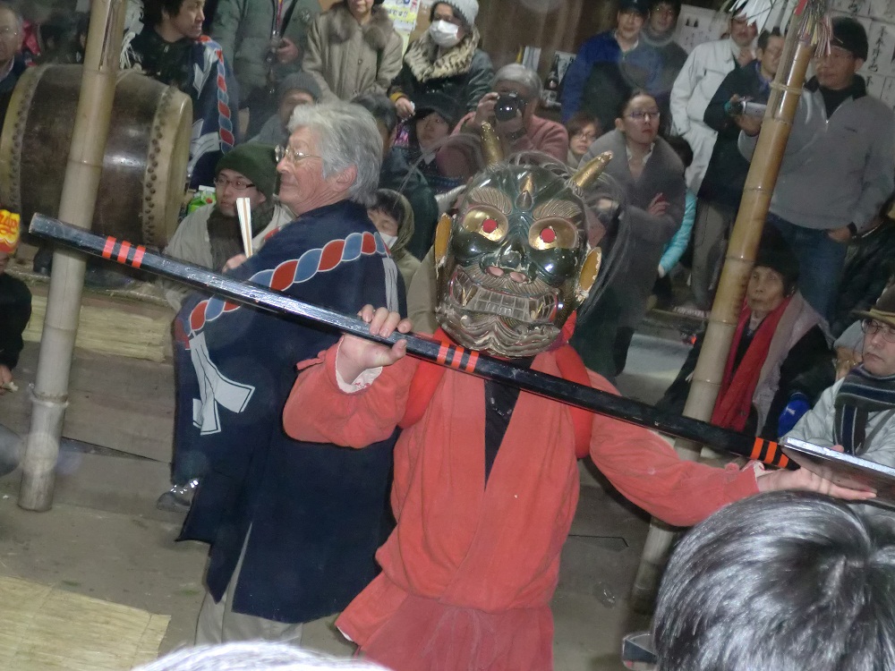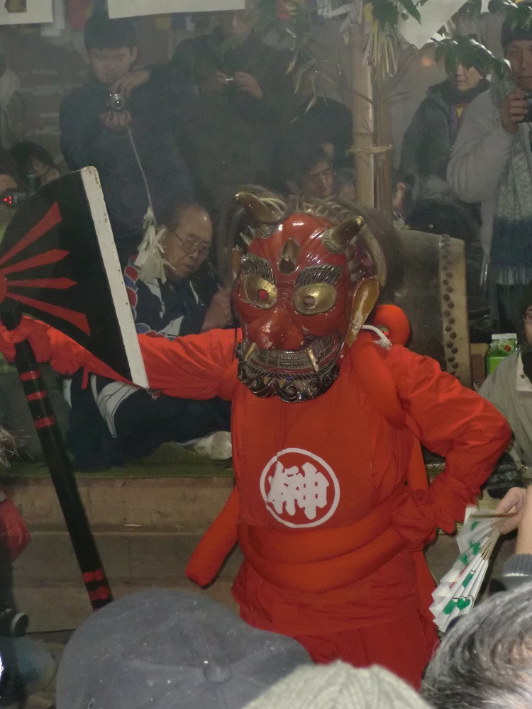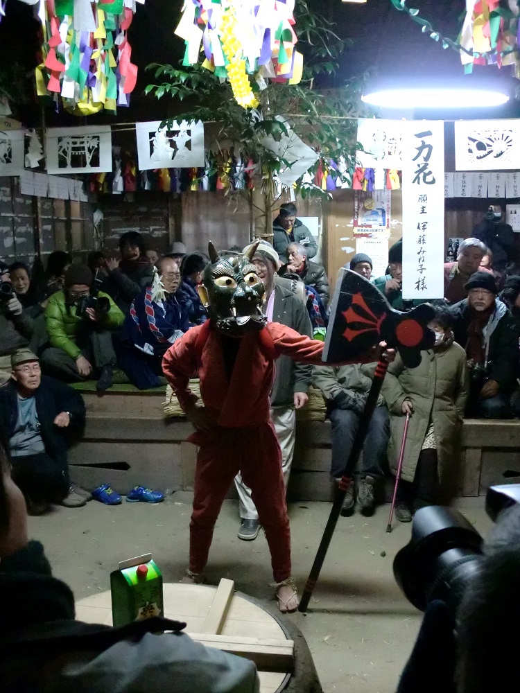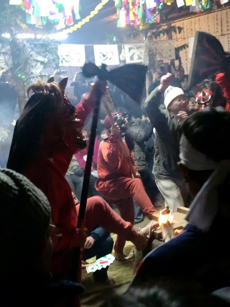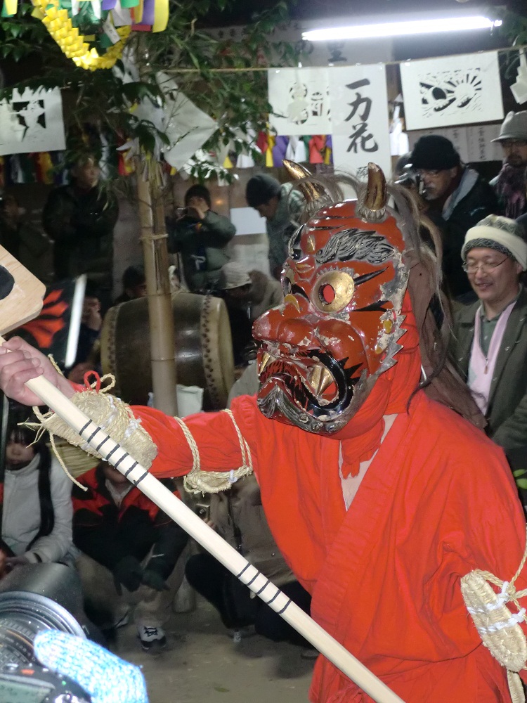 京都:京都市上京区 大将軍商店街 2013.03.20 Wed 22:29:01 妖怪絵馬100枚展 怪作戦も出品中!おこんばわん。 皆様、祝日を休日をお過ごしでしょうか? 私は出勤でしたよ!テラでございます。 いよいよ本日より始まりました 「妖怪絵馬100枚展」、怪作戦も出品しておりますよ! 「妖怪絵馬100枚展」や、開催場所「Art Labo深川いっぷく」さんの詳細はこちら。 http://shikimizu.blog7.fc2.com/blog-entry-144.html http://www.fukagawa-ippuku.jp/ 一部趣旨を引用させていただくと、 「ツイッターの妖怪紹介bot「瓶詰妖怪」より好きな妖怪を選んでいただき、 皆様の思い思いの妖怪を100枚の絵馬に描いて展示するという企画」 でございます。 瓶詰妖怪ボットはこちら。 https://twitter.com/bottle_youkai という訳でこちらの絵馬を出展させていただきました! 桂つかさ作 おとら狐 1500円にて展示販売中!(売れてなければ) 桂つかさ作 二龍松 2000円にて展示販売中!(売れちゃってなければ) 蘭陵亭作 ヤロカ水 2500円にて展示販売中!(売れちゃってなければ) はい、安定の地元愛知押しです(笑)。 どんな妖怪?と思った方は、よかったらこちらの 「愛知おもてなし妖怪隊」サイトをどうぞ! http://aichiyoukwaitai.web.fc2.com/ という宣伝。 …ちょっとマニアックなので、とっつきにくいかも知れませんが…。 この「妖怪絵馬100枚展」は、24日(日)まで開催されています。 関東圏にお住まいの方は是非お出かけくださいませ! っていうか、行きたかったですよ! 2013.03.18 Mon 21:29:40 布川の花祭りに行ってきました。④おこんばわん。テラでございます。 もう、今回で終りますから、まー少々お付き合いくださいましね? 前回、翁の舞まで見て、そろそろ寝とかんと運転がツライと判断して一旦車に退避。で、二時間ほど仮眠してモソモソ起き出したら、ちょうど朝鬼が舞っている所に間に合いました! 茂吉鬼さん。一応この舞の主役(でいいはず)。 この面は「鼻たらし」でいいはず。 …鬼…かしら(笑)? どちらも茂吉鬼の伴鬼でいいはず。 茂吉っぁんは鉞(まさかり)でなく、槌を持ってます。 アップ。 しかし、インパクトのある顔です。鼻たらしさん。 釜の周りを舞ってます。 こうして無事朝鬼も見ることができました。 お次は獅子舞。 我ながらなかなか良く撮れた気が。 鎮めの神事。 Mr.カラテではありません(古い)。 はい!テラによる布川花祭りレポートは以上で締めたいと思います!長々とお付き合いいただきまして、ありがとうございました。 いやー、ハードでしたけど、色んな鬼さんも出て来て飽きないですね。 特に周囲に混ざって「てーほへてほへ」と唱和していると、どんどんトランスしてきます。また、他の地区の花祭りにも行きたいですね。 2013.03.13 Wed 22:58:36 布川の花祭りに行ってきました。③2013.03.09 Sat 21:11:42 布川の花祭りに行ってきました。②はい、北海道以外の皆様、暑いですね! テラでございますよ! なんか、花祭りに行ってきたらホントに春が来ちゃった感じがしてます。 (本来は11月のお祭りですけどね) さて!能書きは兎も角前回の続きです! 舞はひたすら続きます。 んで、深夜四時ごろ、榊鬼の伴鬼さん登場。 黒っぽいですけど、青鬼の面みたいです。 「古よりの花祭り」によると。 テーホヘテホヘ アップ。おそがい。 更に榊鬼の伴鬼さん登場。 これは火の鬼の面みたいです。 なんかお尻にも草鞋?つけてたんですね。 撮影時は気付かなかった。 これは結構綺麗に撮れたかな。 撮影環境も苛酷なのでなかなか難しい。 更に更に引き続いて小さい伴鬼さんも登場! この面には特定の名前はないみたい? そんなこんなで彼等だけでも一時間ほど舞ってたでしょうか。 多分深夜…というか早朝五時くらい? 遂に榊鬼様登場! お腹に輝く丸に榊! (わかりやすい) …といった所で今宵はここまでということで。 次の更新をお楽しみに! 2013.03.05 Tue 23:05:24 布川の花祭りに行ってきました。①はい、どうもおこんばんわ。 表題の通り、3/2(土)~3/3(日)布川の花祭りに行ってまいりました。 花祭りもこれで三度目です。 ほぼ徹夜。昨日まで死んでました(笑)。 たくさん写真を撮ったので、何回かに分けてご紹介できたらと思います。 なお、写真や祭りの説明は「間違っている可能性大」なのでご注意ください! 舞庭(まいど)の様子。 湯蓋やざぜちが見えます。 花の舞(一力花)…で合ってると思いますが…。 これも一力花(のはず)。 しかし、ぶっちゃけ幼女の舞と老人の舞で、 盛り上がりもカメラも露骨に違うのが面白かったです(笑)。 いよいよ、山見鬼の伴鬼A(仮称)登場。 手に持っているのは鉞(まさかり)。 昔は斧だと思ってましたよ! 続いて山見鬼の伴鬼B(仮称)登場。 ちょっと新しめの面っぽい? 更に山見鬼の伴鬼C(仮称)。 このお面、古そうなんですけど、 「古よりの花祭り」に載ってない感じ? 二人(?)並んだ横顔。 そして遂に山見鬼様登場! キャー!抱いて!! ちょっと隠れてますが、お腹に山の字が。 (わかりやすい) 足元にござが敷かれてますね。 伴鬼には無かったっぽい? あと、手前に火の