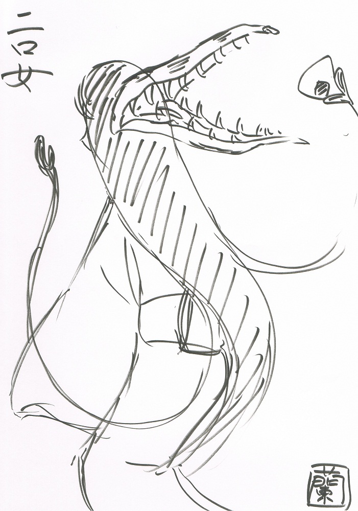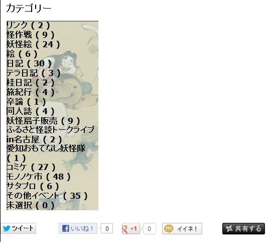 怪作戦こちらは妖怪サークル「怪作戦」のサイトです。 テラ、桂つかさ、蘭陵亭の三人で、東海地方を中心に、コミケや京都で活動中。主にサイトは蘭陵亭の絵と文です。 禁無断転載。PAGE | 27 28 29 30 31 32 33 34 35 36 37 | ADMIN | WRITE 2012.10.06 Sat 01:10:05 【番外編】過日サタプロの妖怪ライブペイント絵 岩里藁人さん編②どーもどーも! 世間的には三連休に入った方も多いんではないでしょうか。 テラでございましたよ? 先日からの続きですので、まずはコピペ説明で。 過日出演させていただきましたサタデープログラム「妖怪ライブペイント~百怪繚乱~」 http://www.satprogram.net/index.html http://ranryoutei.blog.shinobi.jp/Entry/203/ こちらで描いた妖怪画のご紹介です。 厳密には「こちらで描いた妖怪画」ではありませんがw 先回最後に触れましたように、イベント本番前に内々にリハーサルを行っておりまして。 そこで描いた妖怪も、この際ご紹介させていただいちゃおう!と思います。 このまま私の手元で眠らせておいても勿体にゃあですで。 *あくまでもリハーサル用に描いたものですので、紙の両面に描いて裏写りしていたりしておりますが、ご了承くださいませ。 今回も番外編の続きです。 一緒にイベントに出演しました、岩里藁人さんの妖怪画を、許可をいただいて掲載させていただきますよ。 例によって例のごとく、全て5分ほどで即興で描かれたものです。 うぶめ。 からかさおばけ。 かわうそ。 舞首。 瀬戸大将。 びろ~ん。 鎌イタチ。 蛇骨婆。 桂男。 ・・・あれ?どこかで見た顔!? というオチがついたところでお終いです(笑)。 あと、サタプロ本番の合作絵も載せておりませんでしたので、 ここで載せておきます。 女郎蜘蛛、龍、九尾狐。 これは流石に5分で描いたものではないです(笑)。 ・・・ふぅ。ようやく宿題が一区切りに。 しかし、告知してないことも山盛りで、そもそもモロモロ準備もお尻に火がついております。順次告知したり、活動したりしてまいります。 よろしくお願いいたします。 PR 2012.09.27 Thu 22:39:03 【番外編】過日サタプロの妖怪ライブペイント絵 岩里藁人さん編①やー、涼しいような、まんだ暑いような微妙な気候でございますね。 皆様、風邪など引かれませんよう。 テラでございます。 はい、まずはコピペ説明。 過日出演させていただきましたサタデープログラム「妖怪ライブペイント~百怪繚乱~」 http://www.satprogram.net/index.html http://ranryoutei.blog.shinobi.jp/Entry/203/ こちらで描いた妖怪画のご紹介です。 今回は番外編。 一緒にイベントに出演しました、岩里藁人さんの妖怪画を、許可をいただいて掲載させていただきますよ。 例によって例のごとく、全て5分ほどで即興で描かれたものです。 化け草履 ちょっと自己紹介的な意味でキノコ分が補充されてますw 舞首。 嫁・姑に囲まれて首が回らない的な。 がしゃどくろ。 わいら。 ちゃんと(?)モグラを食べてますw 以津真天。 煙々羅。 ・・・当時は気付かなかったけど、男子トイレで吸ってる図なんですかね? 牛鬼。 ホルスタイン!! 水虎。 豆腐小僧。 夕陽の瀬戸大将。 この瀬戸大将の完全版(?)的なイラストは、 こちらの「愛知おもてなし妖怪隊」WEサイトのギャラリーにも掲載しております! http://aichiyoukwaitai.web.fc2.com/ ・・・という、安定の宣伝乙でした。 次回はせっかくだし藁人さんのリハ画像もアップしちゃおうかなぁと思っております。よろしくお願いいたします。 2012.09.22 Sat 22:34:08 過日サタプロの妖怪ライブペイント絵 蘭君編②遠野いいなぁ羨ましいなぁ! テラでございますよ。 それはそれとして、タンタンと先日からの続きをご紹介させていただきますよ。 内容はほとんど変わらないので、ぶっちゃけ説明文はコピペ一部訂正でお送りします! 先日よりご紹介しております、 過日出演させていただきましたサタデープログラム「妖怪ライブペイント~百怪繚乱~」 http://www.satprogram.net/index.html http://ranryoutei.blog.shinobi.jp/Entry/203/ こちらで描いた妖怪画。 厳密には「こちらで描いた妖怪画」ではありませんがw 先回最後に触れましたように、イベント本番前に内々にリハーサルを行っておりまして。 そこで描いた妖怪も、この際ご紹介させていただいちゃおう!と思います。 このまま私の手元で眠らせておいても勿体にゃあですで。 *あくまでもリハーサル用に描いたものですので、紙の両面に描いて裏写りしていたりしておりますが、ご了承くださいませ。 全て蘭陵亭作。これらも5分くらいでドンドン描いていったものです。 琵琶牧牧。 かわいいですねー。 なんで泣いておるんですかね? びわシクシク? やまびこ。 楽しそうですねー。 しかし、こんな山頂にいては、声は反響して戻ってこないようなw 化狸。 大きいですねー。 二口女。 最近、地元愛知にも二口女の話があると知って嬉しいです。 師崎の「化道ぐも」って話しなんですけど・・・ バケミチ蜘蛛?バケドウ蜘蛛? 読み方がようわからんです。 無三殿さん。 この「無三殿さん」などの愛知の