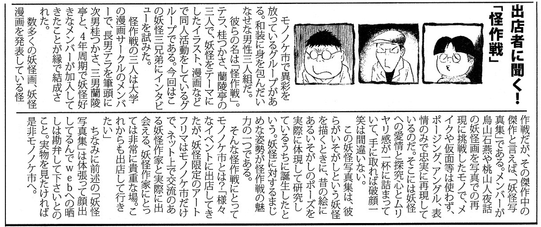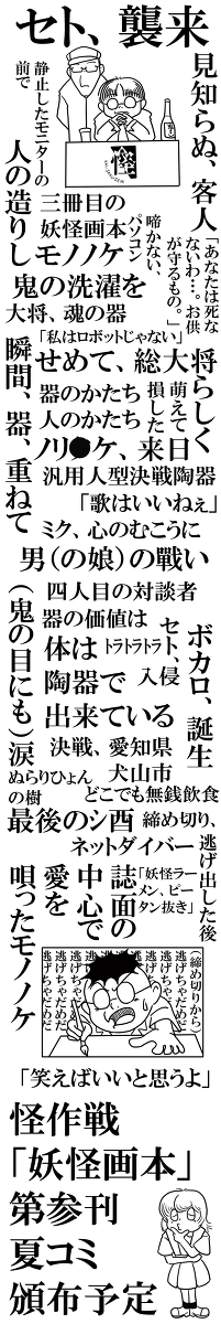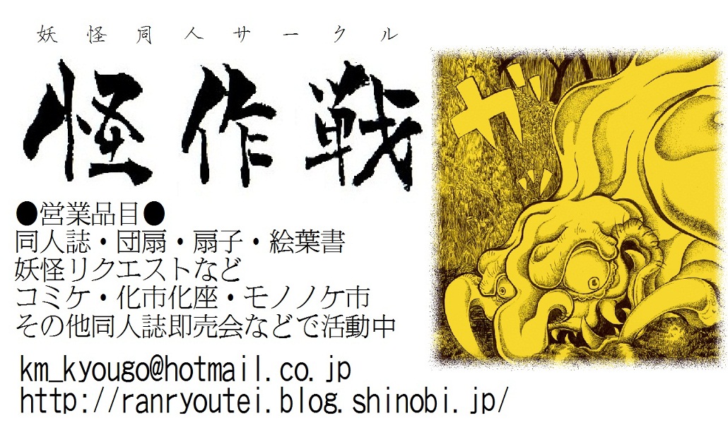 しかし、これまでの本の後書きにも書いているように、 2011.08.09 Tue 22:02:03 8/14(日)コミケ80頒布詳細①日本の夏、妖怪の夏、コミケの夏でございます。 すいません、先日のモノノケ市レポートはコミケ明けと言うことで…。 頒布詳細を告知させていただきたいと思います。 8/14(日)コミケ80 怪作戦 東Q43b 【同人誌】