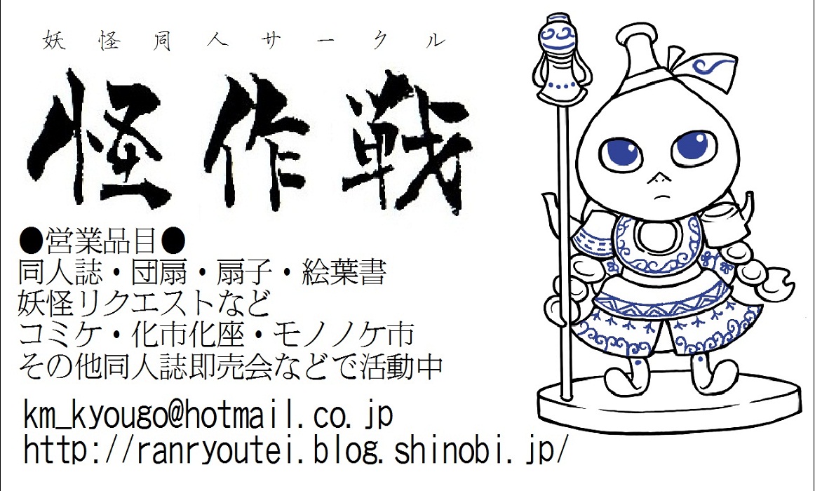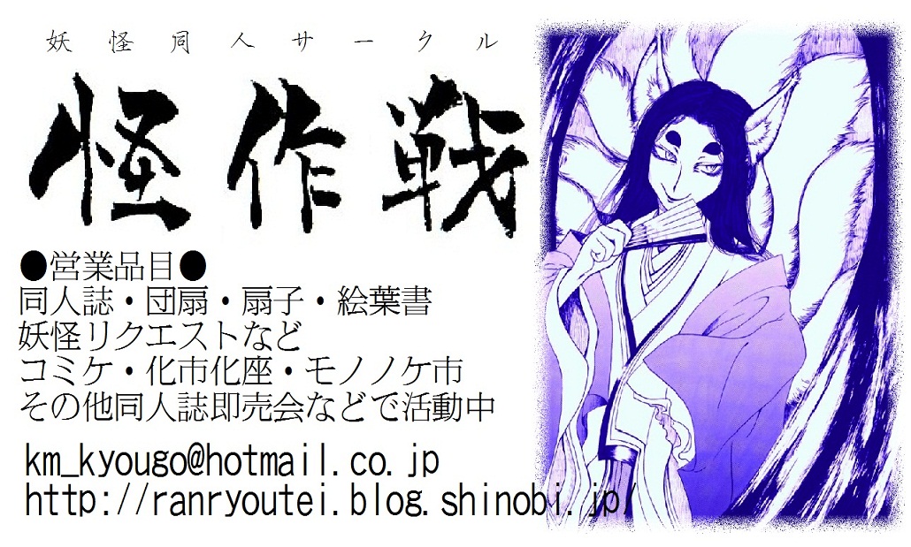 現地には蘭陵亭がいます。 テラは… 一応、仕事後に顔を出す…予定! 早ければ7時頃に着ける…はず。理論上は(笑)。 妖怪好きの皆様にご愛顧頂けますと幸いです。 2011.07.28 Thu 11:26:20 新作名刺②2011.07.24 Sun 20:30:00 新作名刺① |