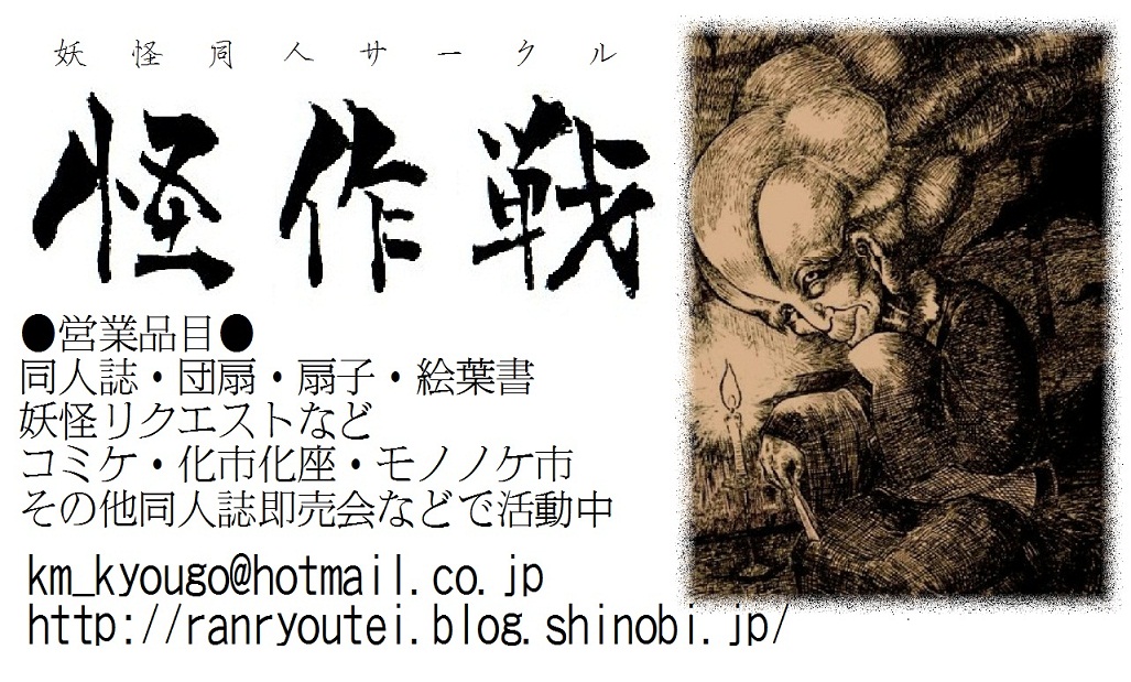 怪作戦こちらは妖怪サークル「怪作戦」のサイトです。 テラ、桂つかさ、蘭陵亭の三人で、東海地方を中心に、コミケや京都で活動中。主にサイトは蘭陵亭の絵と文です。 禁無断転載。PAGE | 33 34 35 36 37 38 39 40 41 42 43 | ADMIN | WRITE 2011.09.23 Fri 21:59:32 前回(7/31)のモノノケ市の時に描いた妖怪団扇紹介…えー。 もう二ヶ月前の話ですが…。 7/31開催のモノノケ市の時に蘭陵亭が描いた妖怪団扇のご紹介です。 テラは仕事後に駆けつけてますが、ぶっちゃけ一時間くらいしか滞在してません(笑)。 ホントは久しぶりに蘭君がイベントリポートするはずだったんですが…すっかり時間が経っちゃいました。 とは言えせっかくなのでさらっと作品だけ紹介させて頂きます。 崇徳院。 ロンゲですね。 付喪神 こっそり水木系化け草履が混ざってます(笑)。 塗壁。 目を閉じてお眠ですね。 たまには立ち塞がらないのもいいものです。 骨女。 骨まで愛して! 雪女。 涼しい風が生まれそうな団扇です。 一ッ目小僧 夜まで開催していたのでこんな写真に。 これはこれで(写真として)味があるかも? 豆腐舐めてるだけに。 当時のイベントの様子が載っている妖怪ストリートの公式ページはこちら。 怪作戦も写ってます。 http://www.kyotohyakki.com/web_0317/katudou/2011_0731mononokeichi.html 次回モノノケ市は10/15開催です。 怪作戦も参加予定でおります。 その節はまたステキなリクエストをいただけますと幸いでございます。 今後ともよろしくお願いいたします。 PR 2011.09.14 Wed 11:44:09 物怪新聞第二号(前回の号)の怪作戦関連記事えー、またまた半月ほど放置してしまいました。