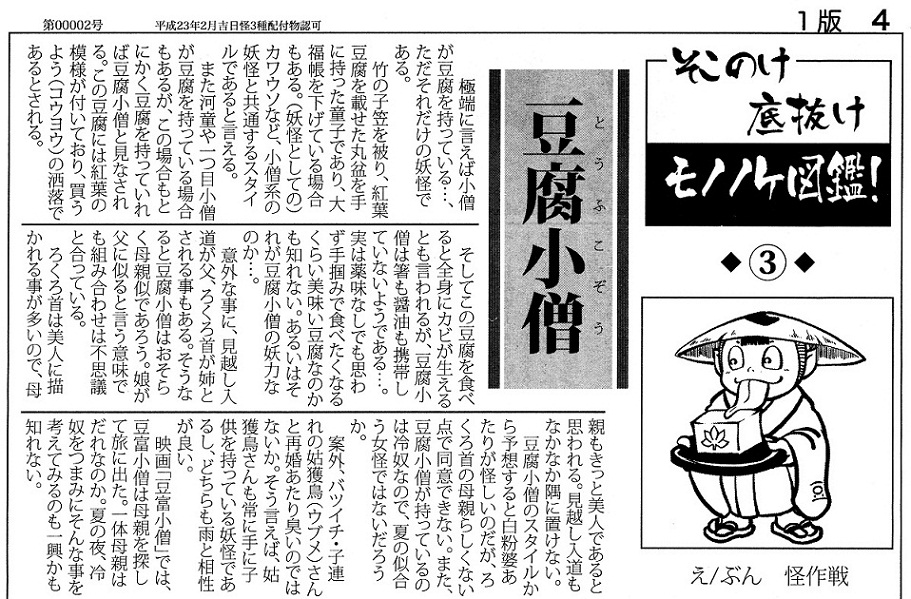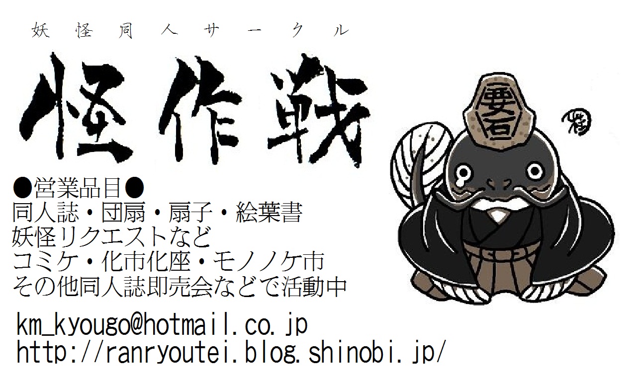 残暑厳しい中、皆様いかがお過ごしでございましょうか。 怪作戦のテラでございます。 本日はモノノケ市にて配布される物怪新聞に掲載された怪作戦関係記事のご紹介です。 一つには勿体無くも、「出展者に聞く!」と言う事で怪作戦自体の紹介記事。 もう一つは怪作戦が絵を文を書いた豆腐小僧の記事です。 一応次の号でもモノノケ図鑑!コーナーでは怪作戦が執筆予定です。 と言うかさっき入稿しました…。 次回のモノノケ市は10/15(月)開催! http://www.kyotohyakki.com/web_0317/top.html 怪作戦も多分参加すると思います。 正式には別途告知させて頂きたいと思います。 個人的には10月からはようやく基本土日休みになる…はずなので(笑)。行きたいです。 2011.08.27 Sat 22:23:11 夏コミの時の新作団扇。2011.08.22 Mon 02:50:16 嵐電のこと嵐山駅妖怪電車モノノケ市行ってまいりました!