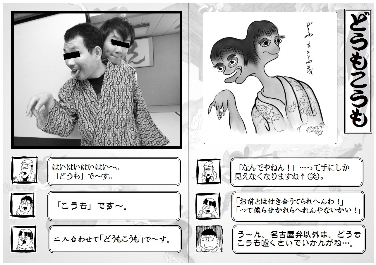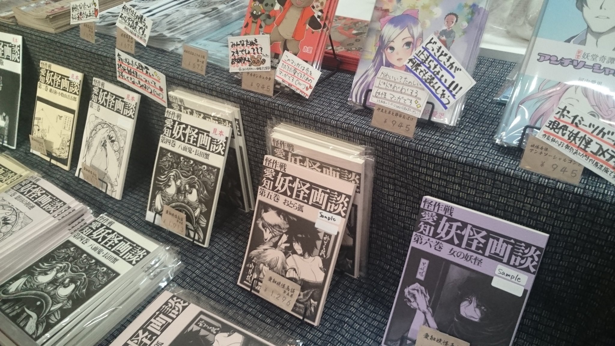 怪作戦こちらは妖怪サークル「怪作戦」のサイトです。 テラ、桂つかさ、蘭陵亭の三人で、東海地方を中心に、コミケや京都で活動中。主にサイトは蘭陵亭の絵と文です。 禁無断転載。PAGE | 3 4 5 6 7 8 9 10 11 12 13 | ADMIN | WRITE 2018.06.21 Thu 23:40:05 6/23(土)泊れる!モノノケ市と妖怪写真ワークショップう~ん仕事が忙しくて原稿が進んでいない…。 テラでございます。 直前の告知で恐縮でございます。 6/23(土)の「泊れる!モノノケ市 in 宇多野ユースホステル」に出店します。 http://www.kyotohyakki.com/ …まぁ、ずっと「ユースホテル」だと思ってたよね。 *ユースホステルです。 まぁ、直前の告知ですし詳細はリンク先を見ていただくとして(笑)、場所は宇多野ユースホステルで、雨天開催ですので。 怪作戦の頒布物はだいたいいつものですが… 今回は、食事会終了後の20:30より 「怪作戦プレゼンツ みんなで妖怪写真を撮ろう!」ワークショップ を開催させていただきます! 怪作戦を知っている人には言わずもがなですが、妖怪を形態模写している御馬鹿な「妖怪写真」。せっかく「泊れる」モノノケ市なので、皆でワイワイ楽しく撮ろうかと。 …ぶっちゃけあんまり事前準備しとりませんので(笑)、ノリと勢いではっちゃけようと思います!お気軽にご参加ご協力お願いいたします! PR 2018.06.10 Sun 21:32:48 C94夏コミ受かりました!暑かったり寒かったり降ったり止んだり…。 体がワヤになってまうがね。テラでございます。 夏コミ受かりました! 3日目8/12(日) 東ピ-07bです! https://webcatalog-free.circle.ms/Circle/13903081 ゴロは…ピンナビってとこでしょうか。 (そういうボーリングのボールはあるみたい) 新刊はサークル10周年記念本『怪作戦クロニクル 妖怪・オタク界隈の平成史』の予定です。 自分達自身の活動は元より、「妖怪」「オタク」を切り口に、平成後半の10年を振り返る内容になります。 鋭意製作中ですので、どうぞよろしくお願いいたします。 2018.06.02 Sat 21:04:15 在庫復活!COMIC ZIN様での委託販売!暑かったり寒かったり…今日は暑い。 テラでございます。 委託にて通信販売していただいているCOMIC ZIN様。(店舗にもあり) しばらく在庫切れで多くの冊子が購入不可状態になっていたのですが、在庫復活で購入できる状態になっております。『愛知妖怪画談』シリーズ、二巻~六巻まで購入できます!地元である愛知の妖怪を描き、語る。面白詳しいシリーズでございます。 http://shop.comiczin.jp/products/list.php?category_id=6364 イベントとか、なかなか行けないよ!って方など、是非ご購入いただけたらと思います。 どうぞよろしくお願いいたします。 2018.04.29 Sun 20:32:27 妖怪・ミイラ展に行ってきました。2018.04.21 Sat 15:04:27 妖怪・ミイラ展の箱フォさんの物販コーナーに。今日は暖かいですね。テラでございます。 本日4/21(土)から名古屋パルコで「妖怪・ミイラ展」が開催されておりますね!5/13(日)まで。 https://tv-aichi.co.jp/youkai/ 実はこちらの「箱の中のユーフォリアさんの特設物販コーナー」にて、怪作戦の同人誌も置いていただいております! 上記のポスター、イメージ画も、箱の中のユーフォリアさんで描かれたもの。すごい! しかし、ご縁あって怪作戦の同人誌が名古屋パルコに並ぶ日が来るとは…。ありがたいことです。 ガッツリGW期間にも被りますから、是非是非皆様お出かけくださいませ。よろしくお願いいたします。 2018.04.08 Sun 20:54:59 4/7(土)モノノケ市でお描きした妖怪扇子などモノノケ市お疲れ様でございました。テラでございます。 …終盤の雨は残念でございましたね。 まぁ、朝から中止にならず、無事開催されて良かったことです。 今年一回目のモノノケ市、多くの方にお立ち寄りいただきまして、誠にありがとうございました。 当日にお描きした妖怪扇子などのご紹介です。 出店風景。 今回は、後ろの幅が少なかったので、ポスタースタンドを立てておらず、要塞の立て比率が少ないです(笑)。ただ、結構、通られる方の視線に入る位置でしたので、下に貼った妖怪地図にも目を留めていただけました。 蘭陵亭子梅作 天狗 蘭陵亭子梅作 ぬりかべ 蘭陵亭子梅作 白澤(事前に描いていたもの) 桂つかさ作 百々目鬼 本日のご紹介は以上でございます。 今後ともよろしくお願いいたします。 2018.03.31 Sat 22:44:57 祝!怪作戦100周年!!【エイプリルフール】新年度!春!桜!四月! おめでとうございます!テラでございます! 早いもので怪作戦も今年で活動100周年でございます。 来世紀にも末永く皆様に楽しんでいただけますよう、これからも励んでいく所存でございます。 引き続きご愛顧いただけますよう、お願いいたします。 …三河人、徳川家康公に習って、我々も長生きせねば…。 …。 …。 …。 嘘です!すいません! 本当は今年で活動10周年でございます! (2008年2月に結成) 100年は嘘でも、10年。長い…ですね(笑)。 ということで、今年は「怪作戦活動10周年本」を製作中でございます。 「妖怪」「オタク」で振り返る、平成後半史本になる予定です。 鋭意