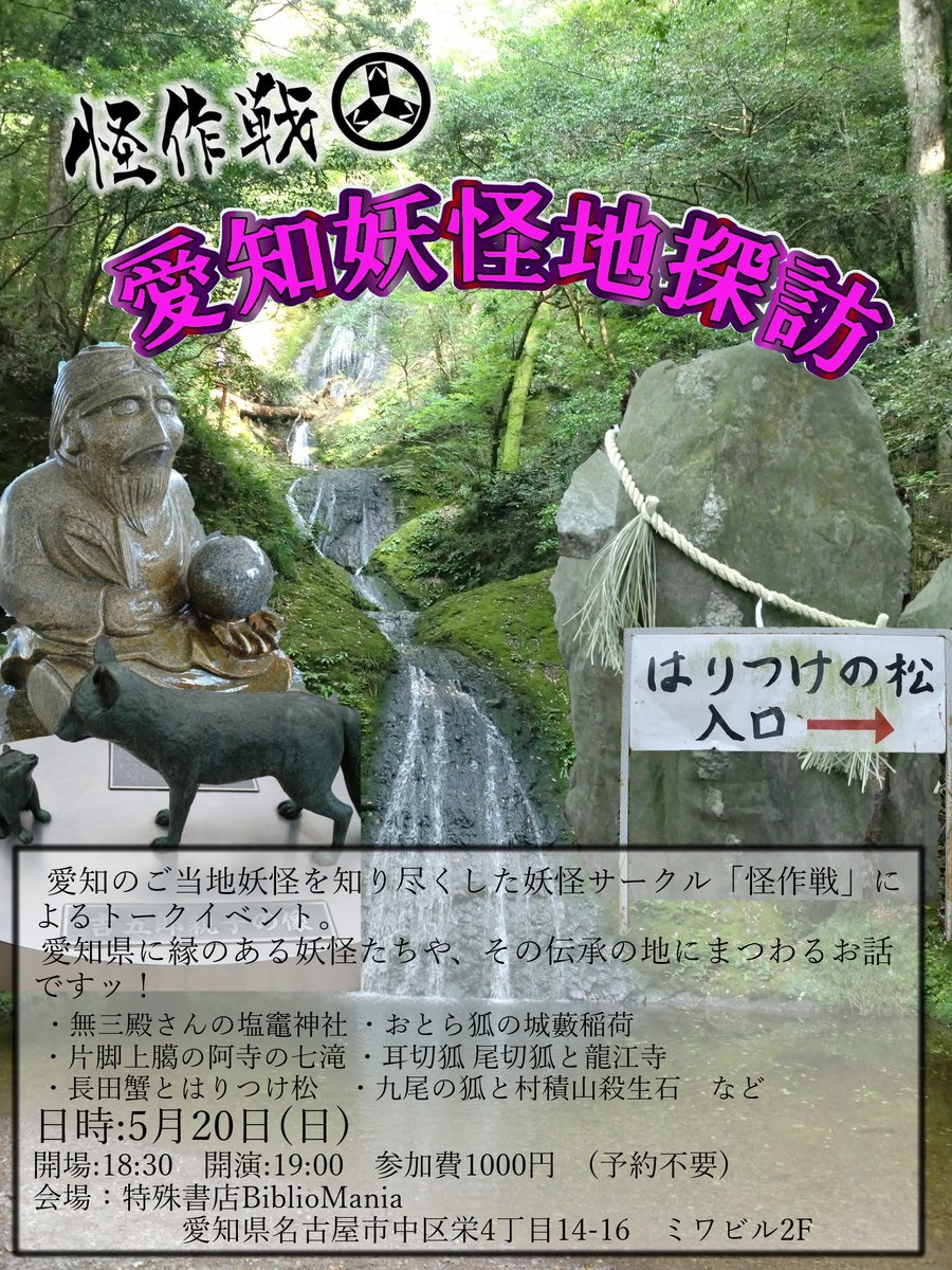 お好みの妖怪をイベント期間中に扇子にお描きします! も、やります! どうぞよろしくお願いいたします。 2018.03.03 Sat 21:50:22 5/20(日)【トークイベント】『愛知妖怪地探訪』特殊書店BiblioMania様にて!イベント告知でございます! 5/20(日)名古屋栄の「特殊書店BiblioMania」様にて、トークイベント『愛知妖怪地探訪』を開催します! 記 5/20(日) 開場 18:30 開演 19:00 予約不要 参加費1000円 会場 特殊書店BiblioMania アクセス→https://bibliomania-books.com/access これまで、地元愛知の妖怪を特集した同人誌を作ってきた訳ですが、色々現地にも行って写真も撮ってきた訳で。一部、冊子にも載せておりますが、カラーで!大きく!色々と!ご紹介しながらお話したら面白いんじゃないかなと(笑)。 予定している内容としては、 ・無三殿さんの塩竈神社